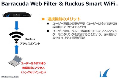 バラクーダネットワークスは、ラッカスワイヤレスの「テクノロジーエコシステム」プログラムに参加し、プログラムの一環として、「Ruckus Smart Wi-Fiネットワーク」環境で実績豊富な「Barracuda Web Filter」を活用。これによって、顧客はURLフィルタリングやマルウェアプロテクションを含むポリシーベースのコンテンツセキュリティ機能を利用することができる。