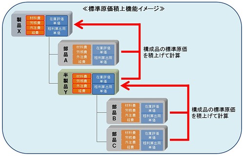 標準原価積上機能のイメージ 「Fu-jin」は、製造業に必要な生産計画や所要量計算、製造管理、工程進捗管理などができる製販一気通貫型の生産管理システムで、製造業のコスト削減、納期短縮、生産効率の向上を支援する。「Raijin」は、「Fu-jin」の機能にプラスして、個別品や特注品などの個別受注生産にも対応し、量産・個別の両方に適したハイブリッド生産管理システム。「Fu-jin」「Raijin」ともに、操作性・汎用性の高い販売管理システム「SMILE BS 販売」をベースに開発した。