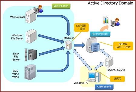 新たに追加した「Log Audit Tracker Server Edition」は、BYOD(個人端末の業務利用)の潮流や、タブレット端末などの業務利用が増加して、多種多様なクライアントがファイルサーバーにアクセスできるような状況で、重要なファイルアクセスを見逃すことなくアクセス証跡を取得する。Windows Serverはもとより、Linux(Samba)で構築したファイルサーバーや、Enterprise NASとしてEMC VNXシリーズ、VNXeシリーズもサポートし、あらゆるファイルサーバーシステムに適応する。