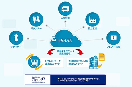 中小アパレルメーカーが集まる全日本婦人子供服工業組合連合会(JWCA)の要望を受けて開発した。NTTコミュニケーションズのIaaS型パブリッククラウド「BizホスティングCloudn」を利用した安価なサービスで、アパレルメーカー向けの商品情報管理のクラウドサービスは業界初。eBASEは、3年間で300社に納入し、1億円の売り上げを目指す。