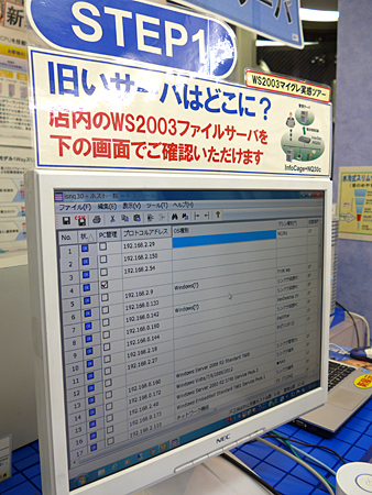 2015年に迎えるオープン10周年を記念して、クラサバ市場秋葉原店では、12月から、イベントや特設展示を行う「お・か・げ・さ・ま 祭り」を開催。その一環として「Windows Server 2003マイグレ実感ツアー」を実施している。複数の「STEP」でWindows Server 2003で動いているサーバーを発見するツールや、データ容量をスリム化して、業務を停止せずにデータを移行するツールなどを紹介している。こうして販社の提案活動を支援し、サポート終了を商機にしようとしているのだ。「マイグレ実感ツアー」への参加は無料で、ウェブ(http://jpn.nec.com/ichiba/)から申し込むことができる。