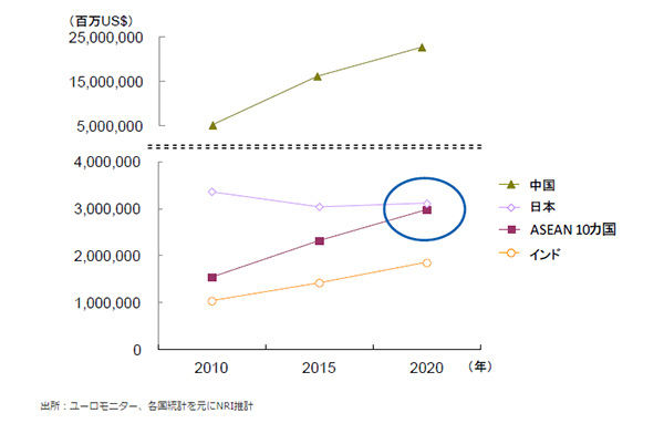 決済・電子マネー市場では、交通系プリペイドカードや携帯電話を利用した送金サービスなど、ASEAN地域が多様な決済手段・電子マネーが競い合う世界の展示場となっていることなどから、2020年に非現金決済金額の合計が日本と同規模の約3兆ドルに達すると予想。NRIは、日本企業にとって重要なことは、流通や鉄道など、電子マネー提供事業への参画だけでなく、域内全域での共通インフラ構築なども含めて取り組んでいくことだと指摘している。
