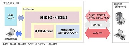流通BMS対応Web-EDIテンプレートは、Web-EDIシステムを容易に構築できるWeb-EDIシステム基盤ソフトウェア「ACMS WebFramer」のオプション製品となる。ACMS WebFramerは、取引のWebサイトにログインするためのID・パスワードやセキュリティなどを管理するユーザー管理機能や、業務管理者や業務担当者のアクセス状況を記録する業務ログ管理機能などを装備したWeb-EDIシステムを短期間で構築し、運用を容易にするためのシステム基盤。従来は、ACMS WebFramer上で取引業務アプリケーションを、導入ユーザーまたはSI企業が個別に開発する必要があったが、流通BMS対応Web-EDIテンプレートは、流通BMSのメッセージ標準に準拠した取引に必要なWebアプリケーションを標準で提供する。
