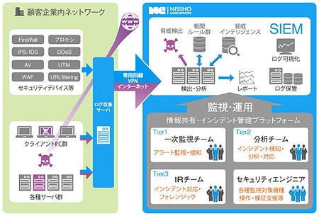 同サービスでは、サーバーログや各種セキュリティデバイスの不正検知と異常検知を自動的に行い、相関分析をすることによってゼロデイ攻撃(未知の攻撃手法)や内部不正を検知する。また、顧客の企業ネットワーク上にログ収集サーバーを設置することでサービスを開始することが可能。顧客が自社でSOCを立ち上げる場合に比べて、導入期間が短く、導入コストも低減できる。さらに、顧客環境の事前アセスメントにより監視対象デバイスを提案。SIEMのチューニングを行った上で監視を開始する。