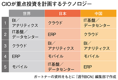 CIOがもっとも重点投資を計画するテクノロジーでは、世界全体が「BI/アナリティクス」だったのに対して、日本は「クラウド」、中国では「IT基盤/データセンター」だった。(真鍋武)