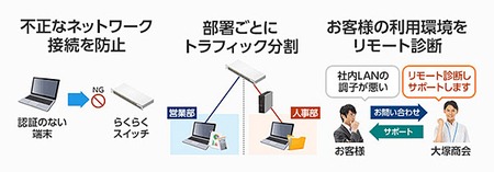 「たよれーる らくらくスイッチ」は、顧客先にスイッチを設置し、必要なすべての設定を行い、大塚商会運用監視センターで24時間365日稼働監視するサービス。ファームウェアのアップデートやアクセス制御によるセキュリティ設定、ループ検知によるネットワーク障害への対応など、顧客にとって最も手間のかかる作業を代行し、必要に応じて遠隔操作による設定変更も行う。 また、障害発生時には、遠隔作業による復旧や技術者が訪問しての機器交換などのサポートを実施する。