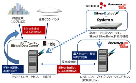 ビットアイルとレノボでは、ビットアイルのデータセンターとレノボ・エンタープライズ・ソリューションズ・センター(東京・秋葉原)に、それぞれSilverBullet折紙付構成を設置し、高帯域のインターネット回線で接続された検証環境を公開し、顧客やビジネスパートナーに提供する。この環境は、SilverBulletによる高速ファイル転送のデモンストレーションや、ハイブリッド・クラウド環境を想定したデータ伝送の性能検証、ビットアイル・データセンターと顧客本番環境間のスムーズな移行を実現するための検証環境として利用できる。