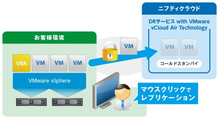 新サービスは、「VMware vCloud Air」が提供する災害復旧サービス「Disaster Recovery」を「ニフティクラウド」の環境で提供するもので、「VMware vCloud Air」のテクノロジーを活用した国内初のサービスとなる。既存のオンプレミス環境がVMware vSphereで仮想化されていれば、「ニフティクラウド」へのレプリケーションをマウスクリックで簡単に行うことができ、シンプルで実現性の高いDR環境を容易に構築できる。