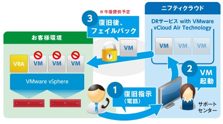 また、「ニフティクラウド」上の仮想サーバー(レプリカ)は、「コールドスタンバイ」の状態で保持され、15分から24時間の範囲の任意の間隔で同期をとることができる。有事の際には、既存環境のvCenterからの操作でフェイルオーバーが可能。万が一、既存環境にアクセスができない場合は、「ニフティクラウド」のサポート窓口に電話で指示することで、ニフティのスタッフが顧客の代わりにレプリカの仮想サーバーを起動する。