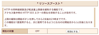 「リソースブースト」は、突発的なアクセスの集中などに対し、これまでの数倍のアクセス処理能力を実現する無料の機能。ユーザー自身でコントロールパネルから、ワンクリックの簡単操作で機能を有効にできる。キャンペーンでアクセスの集中が予想される場合やニュースポータルサイトで紹介されるなど、ユーザーWebサイトに急激なアクセス増加があった場合にも、即座にHTTP 503エラーを回避することができる。有効期間は最大3日間となる。