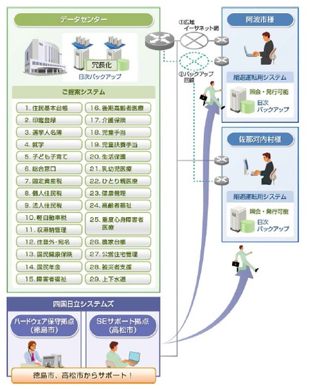 日立システムズ(髙橋直也社長)の地域グループ会社である四国日立システムズ(油屋喜二雄社長)は、4月28日、徳島県の阿波市と佐那河内村が、日立グループの自治体向けソリューションである「ADWORLD 自治体クラウド」を、共同利用型の基幹系システムとして採用し、3月から稼働したと発表した。