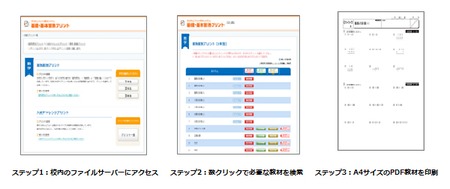 利用法は、学校または教育委員会のファイルサーバーなどにアクセスし、数クリックで必要な教材を検索して、A4サイズの教材を印刷する。専門知識を必要としない簡単なインターフェースとなっているため、先生の授業準備時間を大幅に短縮することができる。
