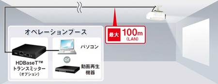 イベント会場などでフルハイビジョンコンテンツ長距離転送のニーズが急速に高まっているなか、EB-Gシリーズ全機種にHDBaseT端子を搭載。従来のHDMI端子では約5mが限界だったが、最大100mの長距離転送が可能となった。また、投射距離が短く、フォーカス性能を向上した大画面・高画質を実現する標準レンズを搭載しているほか、豊富なオプションレンズを用意している。さらに、保証期間を購入後3年とし、万が一のトラブルにも迅速に対応する。