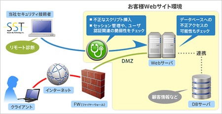 「脆弱性診断サービス」では、ウェブサイトに潜むセキュリティ上の問題点を攻撃者の立場で診断し、SQLインジェクションやクロスサイトスクリプティング(XSS)などに対するぜい弱性を検出する。ウェブアプリケーションのセキュリティ問題に精通する技術者がウェブサイトの問題点を診断することで、情報漏えいなどのセキュリティ事故発生を防止することができる。