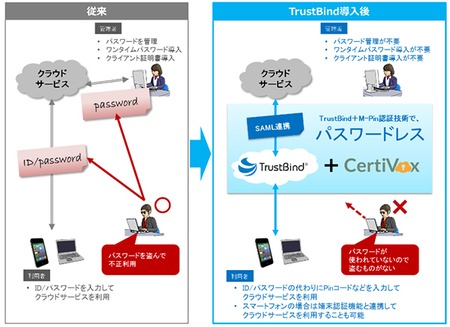 TrustBindは、CertiVoxのパスワードレス認証技術とクラウドサービスの認証を連携し、新たなクラウドサービスの認証方式を提供する。同製品の認証機能を利用することで、クラウドサービス利用時に、より便利で強固な認証を行うことができる。