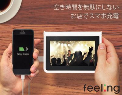 「feeling」は、パーソナル・デジタルサイネージを搭載したスマートフォン充電器。動画広告によりキャンペーン告知や動画プロモーションが可能で、顧客の囲い込みを促進できる。広告や番組配信から専用アプリ連携によるインタラクティブなデジタルコンテンツ・メディアとして、すでに4月下旬からサービスをスタートしており、5月末までに都内近郊500店舗(端末5000台)に設置される予定。