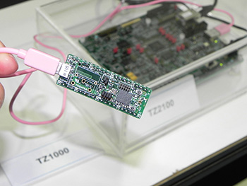 処理能力をもたせたセンサー(手前)と、複数のセンサーをまとめて制御するゲートウェイの試作機。Japan IT Week「IoT/M2M展」で展示中だ。