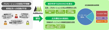 AdMetricsは、広告やプロモーションなどの投資対効果(ROI)を計測し、顧客の広告戦略の意思決定を支援するために、顧客の事業戦略に応じた独自の統計モデルを開発して、データをもとにした客観的な視点で分析するコンサルティングサービス。ビジネスの最前線で統計解析実務に携わってきたSBTのデータサイエンティストが、最先端の統計手法を駆使し、透明性・客観性の高い分析と継続性を高めるコンサルティングを行うことで、顧客にとっての最も効率的な広告投資の実現をトータルで支援する。