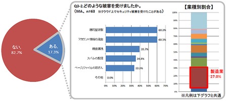 パブリック・クラウドサービスを利用しており、「クラウド上で自社がセキュリティ被害を受けたことがある」と回答した17.3%に被害内容を聞くと、「標的型攻撃」、「アカウント情報の流出」は、それぞれ過半数を超える全体の60.3%が経験していることが判明した。