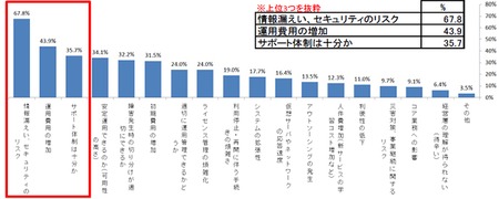 パブリック・クラウドサービスの導入状況に関わらず、クラウド導入に対して不安に思う点を尋ねたところ、1位が「情報漏えい、セキュリティのリスク」で67.8%、2位が「運用費用の増加」で43.9%、3位が「サポート体制は十分か」で35.7%となった。