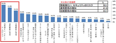 パブリック・クラウドサービスの導入状況に関わらず、実際にクラウド導入を検討した(する)際に障害となった(なる)点を尋ねたところ、1位、2位は同じく「情報漏えい、セキュリティのリスク」、「運用費用の増加」、3位は「初期費用の増加」となり、セキュリティに対する不安がやはり上位にあることが判明した。