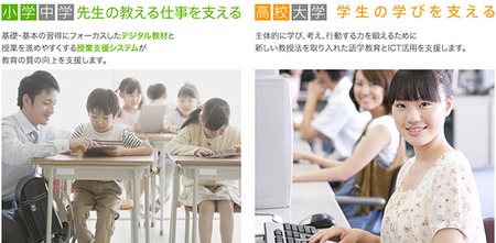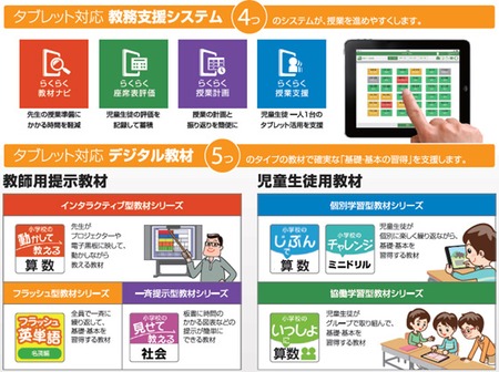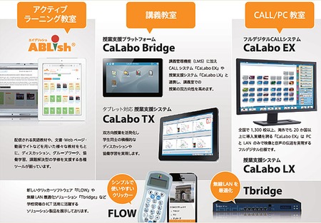 小学校・中学校向けには「先生の教える仕事を支える」をコンセプトに、基礎・基本の習得にフォーカスした5つのタイプのデジタル教材と、タブレット端末対応教務支援システム「らくらく先生スイート」を展示する。高校・大学向けには、「学生の学びを支える」をコンセプトに、アクティブラーニング型学修支援システム「ABLish」、クリッカー「FLOW」、タブレット端末対応授業支援システム「CaLabo TX」など、アクティブラーニングを取り入れた語学教育とICT活用を支援するソリューションを出展する。