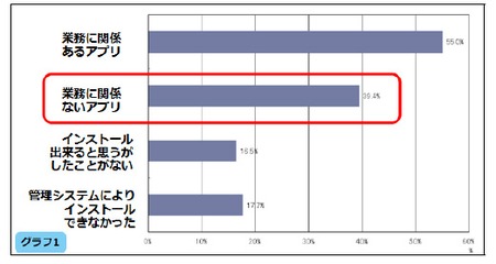 職場から貸与されたスマートデバイスで利用しているアプリについて質問したところ、「職場指定のアプリ(利用を許可しているアプリ)」と、「個人的にインストールをして利用しているアプリ」に差が出る結果となり、システム管理者と従業員・職員の間で、利用ルールの認識にギャップがあることが伺えた。とくに回答として高かったものは、「LINE」などのメッセンジャーアプリや、「Facebook」「Twitter」などのSNSアプリ、ゲームアプリ、音楽・動画閲覧アプリで、職場で指定されていないアプリ、または、利用が禁止されているにも関わらず、個人的にインストールして利用している傾向が高い結果となった。