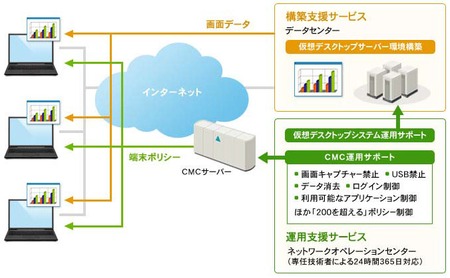 CMCは、Chromebook端末に対する運用管理機能をクラウドで提供するもので、日立システムズではCMCを利用し、端末環境と仮想デスクトップ環境を含めた運用支援サービスをあわせて提供する。運用支援サービスでは、24時間365日体制のネットワークオペレーションセンター(NOC)から、仮想デスクトップ環境のインフラ(サーバーやアプリケーション)の稼働監視を行う。また、Chromebook端末に対するユーザーの追加・削除、ユーザーごとのアプリケーション利用設定に加え、端末の紛失時にはデータをリモートで削除するなど、仮想デスクトップのインフラ・端末の一元的な運用管理を提供する。