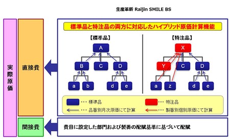 今回発売する新バージョンと原価オプションでは、実際原価管理機能を大幅に強化。標準原価(下位構成から上位に直接費と間接費の標準原価を積み上げた原価)と比較しながら、より正確できめ細かな実際原価計算が可能となった。また、製番別個別原価に加え、品目別月次原価の両モードに対応し、費目に設定した部門・製番の配賦基準に基づいて間接費に配賦も行うことができる。これにより、原価精度が大幅に向上し、原価低減の推進を支援する。