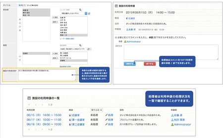 施設の予約承認機能は、会議室や社用車をガルーン上で予約する際に、予約確定の前に承認フローを設ける利用申請機能。予約承認が必要な施設と施設の承認者をあらかじめ設定できる。利用者が該当施設の予約登録をすると、利用申請が承認者へ通知され、承認者の許可を得て初めて該当施設の予約が可能となる。来客用応接室やセミナールームなど、数の限られた施設の利用状況を管理できるように、適切な施設・備品運用を支援する。
