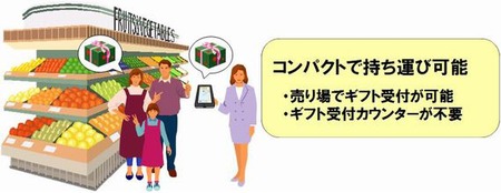 今回、受注端末の機能をタブレット端末にもたせることにより、受注端末を常設することなく、売り場スタッフが売り場でギフト受付をすることが可能となった。また、すでにタブレット端末を他業務で利用している店舗では、所有のタブレット端末に受注システムをインストールして使用することができ、導入コストを抑えることができる。