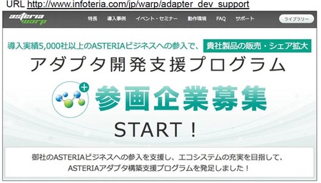 インフォテリア(平野洋一郎社長)は、主力製品のEAI/ESB「ASTERIA WARP(アステリア ワープ)」で、ビジネスパートナー企業が独自にさまざまなデータベースやサービスとの連携機能を強化するアダプタ開発プログラムを、7月1日から始める。
