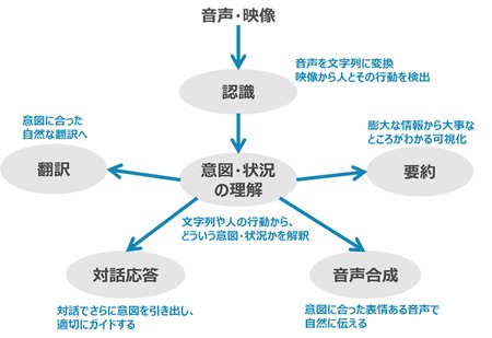 RECAIUSは、人がICTを意識して利用するのではなく、ICTが人の意図や状況に合わせて適切に動作するための仕組みづくりを支援するもの。同社が長年培った音声認識、音声合成、顔・人物画像認識、知識処理技術を融合して、これらの能力を最大限引き出せるよう、必要な知識を日々進化させることが可能なクラウド上で構成されている。さまざまな言葉の表現や人の動き・態度から意図や状況を理解して、要約、翻訳、音声対話、音声合成を利用して、人にわかりやすく伝える。例えば、カメラに写った人に合わせて情報を提示する案内システムや、音声記録をテキスト化して重要な発言だけをチームで共有するなど、幅広い業務や用途で活用できる。