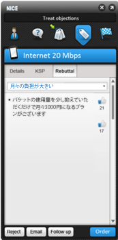ナイス・サービス・ツー・セールスは、「問い合わせの電話を商品販売につなげる」「解約の申し出を別商品の契約に切り替える」など、売り上げの向上や解約防止を支援するサービス。例えば、電話料金の問い合わせを受けた場合、顧客の電話番号などから過去の利用状況を画面表示し、使用している電話の機種が古い場合は「新機種でお客さまにお勧めのプランがございます」とシステムが話法を表示し、提案を促す。顧客が興味を示した場合、オペレーターが「興味あり」のボタンをクリックすると、システムが「電話はよくおかけになりますか?」の質問を促し、「かけない」と返答の場合は、「お客さまにはデータ通信がメーンのプランがお勧めです。金額は……」というように次々と質問を投げかけて、提案していく。