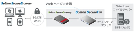 Soliton SecureFileは、既存ファイルサーバーを社内外を問わず、Windows/Mac/iOS/Androidから閲覧を可能にするゲートウェイアプライアンス。既存環境に設置するだけで、いつものWindowsユーザーアカウントでファイルサーバーにアクセスし、Webベースでファイル・フォルダ一覧を表示することができる。Soliton SecureBrowser/Gatewayとの連携により、さまざまな端末から場所を問わず、ファイルサーバーをセキュアに利用できる。