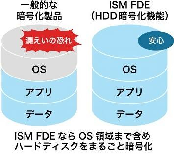 今回、ISM CloudOneに搭載するハードディスク暗号化機能「ISM ディスク暗号(HDD暗号化オプション)」を利用することで、ハードディスクをまるごと暗号化することが可能となり、従来のセキュリティ維持・管理に加えて、万が一の盗難・紛失時にもPC内のデータを強力なセキュリティで守ることができる。