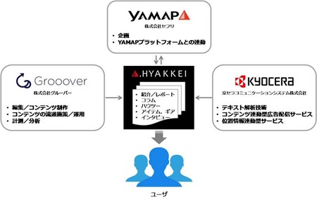 各社の役割としては、セフリは、YAMAPのコミュニティプラットフォームを活用し、多くの人々に記事を提供する。グルーバーは、メディアの編集とコンテンツの制作、計測ツール「TRIVER」によるコンテンツ分析とメディアのマネタイズを担当する。KCCSは、メディア分析とコンテンツ制作のためのテキスト解析技術の提供と、コンテンツ連動型広告の配信やスマートフォンならではの位置情報連動型サービスを提供する。