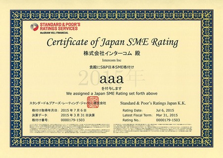 インターコム(松原由高社長)は、15年3月31日決算データで、大手企業格付け会社スタンダード&プアーズ(S&P)の日本の中堅・中小企業向け格付け「日本SME格付け」の最上位格付け「aaa」(トリプルエー)を7月6日付で取得したと発表した。10年3月決算で初めて格付けを取得して以来、6年連続の「aaa」取得となる。