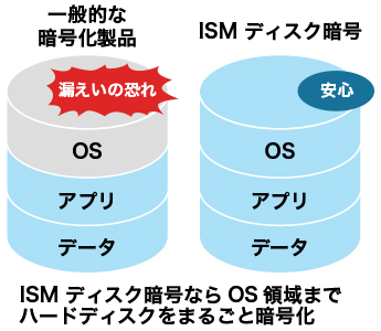今回のISM CloudOne Ver.5.1iに搭載した「ISM ディスク暗号」を利用することで、ハードディスクをまるごと暗号化することが可能となり、従来のセキュリティ維持・管理に加えて、万が一の盗難・紛失時にもPC内のデータを強力なセキュリティで守ることができる。