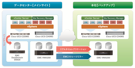 VSPEXは、EMCが提供するリファレンス・アーキテクチャで、事前検証済みのメリットを生かして高い性能と信頼性を確保している。今回、越智建設では、「EMC VNX」ストレージと、IAサーバーは「Cisco Unified Computing System(Cisco UCS)」、スイッチは「Cisco Nexus」で構成されたVSPEXを、本社サーバールームとデータセンターの2か所にそれぞれ導入。EMC VNXの遠隔レプリケーション機能を利用し、両拠点間でのリアルタイム・レプリケーションを行うことで、万一メインシステムがダウンしても、待機側のシステムに切り替えて業務を継続できる体制を整えた。また、VMware vCenter SRMについては、簡単な操作で迅速・確実な業務復旧が行えることが選定の決め手となった。