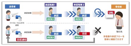 上長承認機能では、承認階層、承認者を任意数設定したり、下位階層の承認を待たずに上位階層による承認など、さまざまな条件での承認設定を行うことができる。また、送信者による承認者の指定(ファイル送信時のみ)や、承認者不在時の代理承認者の設定も可能。ファイル送信者や登録者は、承認状態を把握することができる。