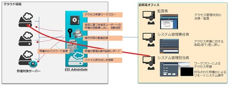 ESS AdminGateは、システムを管理するための特権IDとその証跡を管理するソフトウェア。管理者権限を用いて、システムにアクセスする必要のあるシステム保守・運用者などのユーザーに対し、承認ワークフローにより特権IDを貸与することで、パスワードを隠ぺいしたままアクセス制御を実現するとともに、アクセス内容を動画形式で記録・保管することができる。