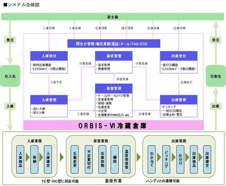 新パッケージORBIS-VI 冷蔵倉庫では、冷蔵倉庫 Ver.IIの特徴である不定貫管理や冷蔵倉庫特有の倉庫内売買に対応した名義変更機能に加え、荷主とのオンライン(EDI)連携機能や入出庫の一括確定機能などを標準機能として装備した。これにより、管理精度の向上だけでなく、作業効率の向上による物流コストの削減を実現する。