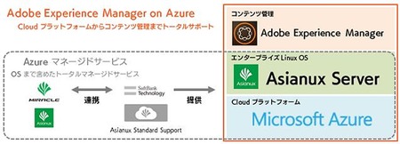 ミラクル・リナックスでは、9月1日にMicrosoft Azureでエンタープライズ向けLinux OSの「Asianux Server」を発売。また、SBTでは、AzureからAzure上のLinux OSをトータルサポートする「Azure マネージドサービス -Asianux Standard Support-」を提供している。今回、SBTグループとして、Microsoft Azureのサービス利用をトータルでサポートする体制を整備し、Azure上のAsianux Serverに構築する商用アプリケーションの第1弾として、SBTによる高度な検証を行った「Adobe Experience Manager on Azure」の提供を開始した。