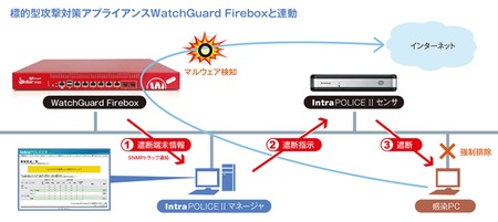 IntraPOLICE IIは、機密情報漏えい対策の基本となる未承認端末(不正機器)の検出と即時遮断を行う製品。ウォッチガードの企業内ゲートウェイとなる次世代ファイアウォール「Firebox」と連携することで、未知のマルウェアに感染した端末の特定・遮断の高速化と自動化を実現し、二次感染による被害拡大や情報漏えいのリスクを低減する。