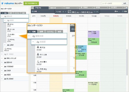 rakumoカレンダー 2015のイメージ① 組織階層からユーザーを探せる組織ツリー