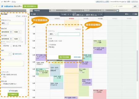rakumoカレンダー 2015のイメージ② 簡易登録機能とサイドペインでの予定登録画面