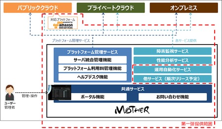 MOTHERでは、複数のクラウドサービスやオンプレミスシステムを統合的に管理する(1)プラットフォーム管理サービスと、(2)障害監視サービス、(3)システムやネットワークの性能を監視する性能分析サービスなどから構成されている。対応プラットフォームの第一弾として、まずはAmazon Web Services(AWS)向けサービスをスタートする。今後は、運用管理の自動化や運用管理用のテンプレートの充実に順次取り組んでいく方針だ(画像参照)。