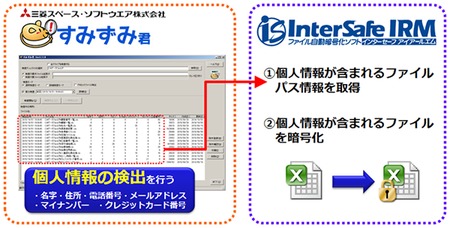 アルプス システム インテグレーション(ALSI、麻地徳男社長)と三菱スペース・ソフトウエア(MSS、稲畑廣行社長)は、協業の第2弾として、マイナンバーを含む個人情報(特定個人情報)の漏えい対策強化を目的に、ALSIのファイル自動暗号化ソフト「InterSafe IRM」と、MSSの個人情報ファイル検出ツール「すみずみ君」の連携機能を搭載したリビジョンの提供を、10月7日に開始した。