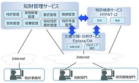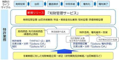 同社では、これまで、企業の知財管理業務の効率化から知財戦略立案業務までを支援する「特許業務ソリューション」を、パッケージソフトウェアとクラウドサービスの組み合わせで提供してきた。今回、クラウドサービス知財管理サービスをラインアップしたことで、発明提案から権利満了まで特許のライフサイクル全般を、クラウドサービスでサポートすることが可能となる。